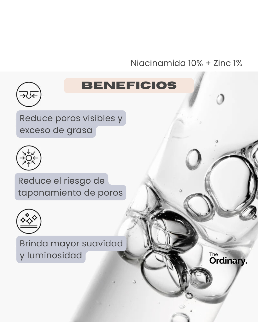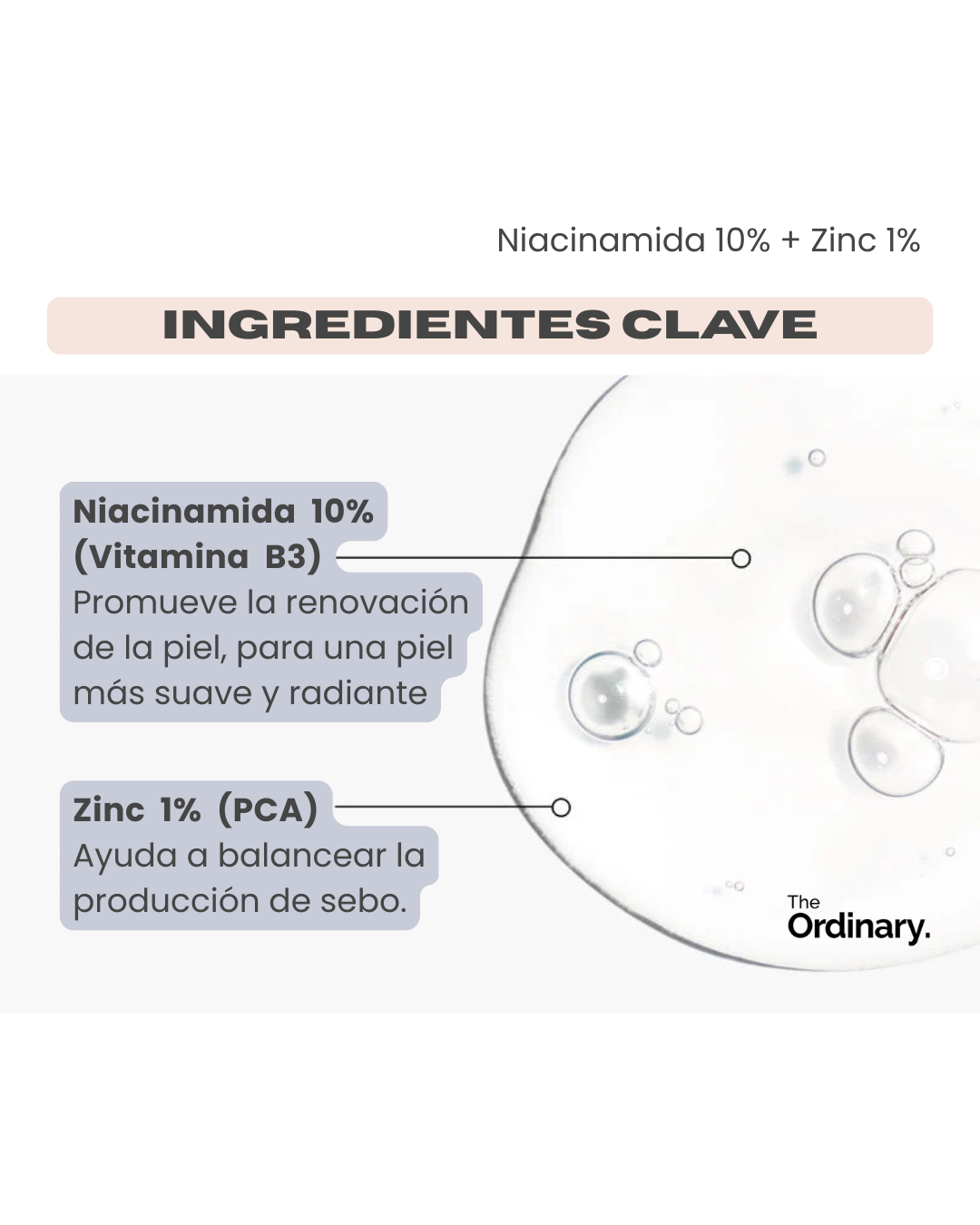 Concentración clínica de Niacinamida que mejora la textura y reduce poros. Más Zinc que cicatriza imperfecciones y controla el exceso de grasa sin resecar.