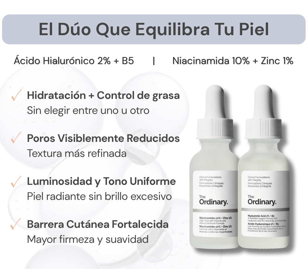 Este dúo rompe el ciclo: hidratación SIN engrasar + control de sebo SIN resecar. Ácido Hialurónico multi-peso molecular + Niacinamida al 10% trabajando juntos. Equilibrio real.